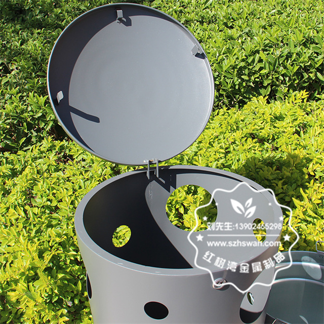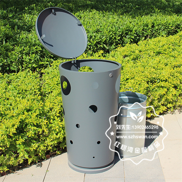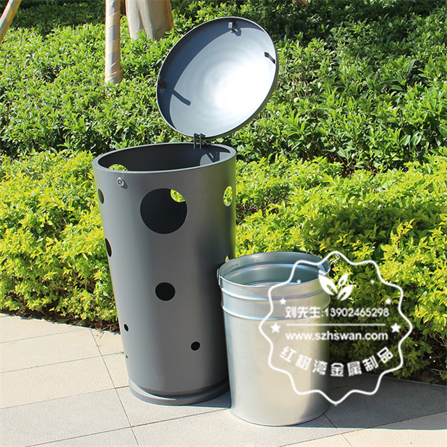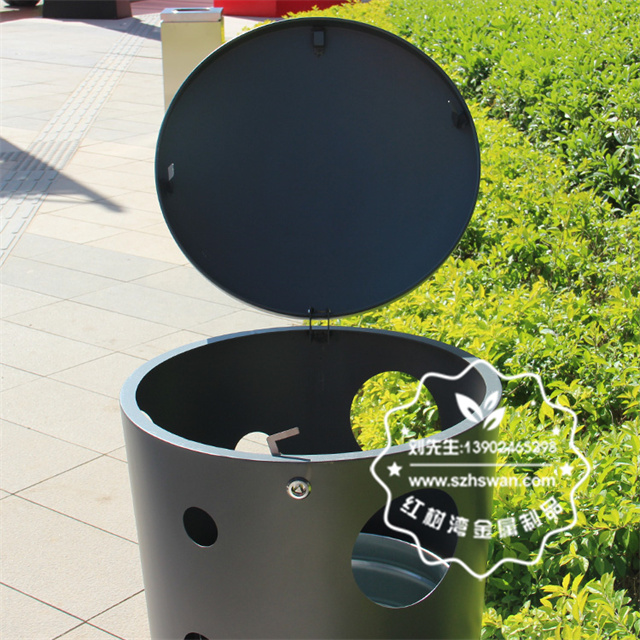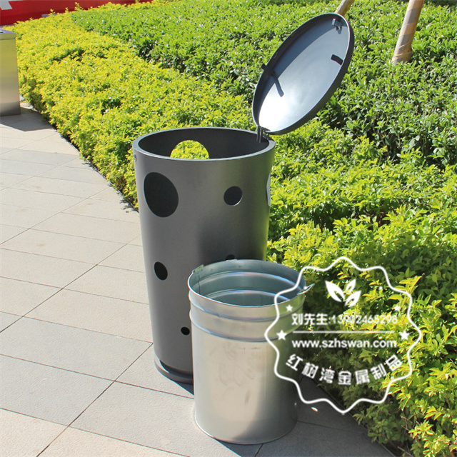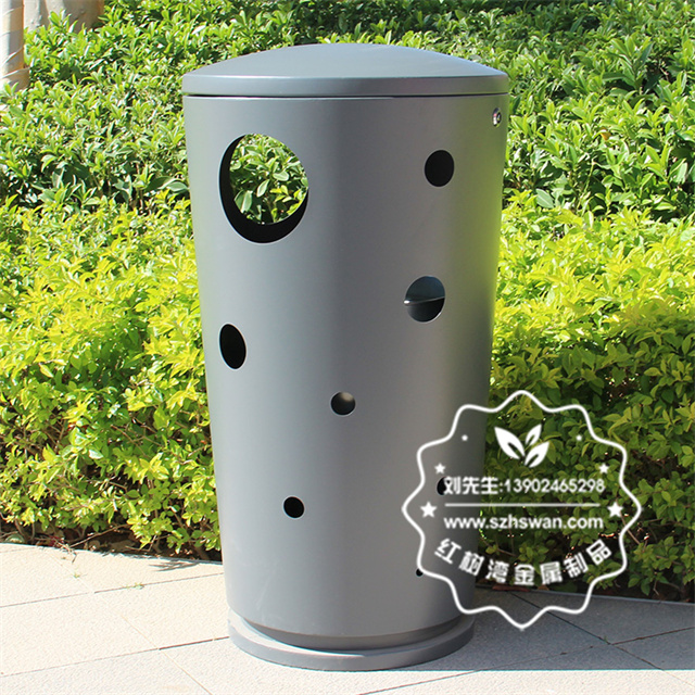 產品材質:戶外圓柱形鏤空不銹鋼垃圾桶采用201#,202#,304#優質不銹鋼材料模壓成型,堅固耐用;內外表面光潔,減少垃圾殘留,易于清潔;配置鍍鋅板內桶,便于垃圾清倒;