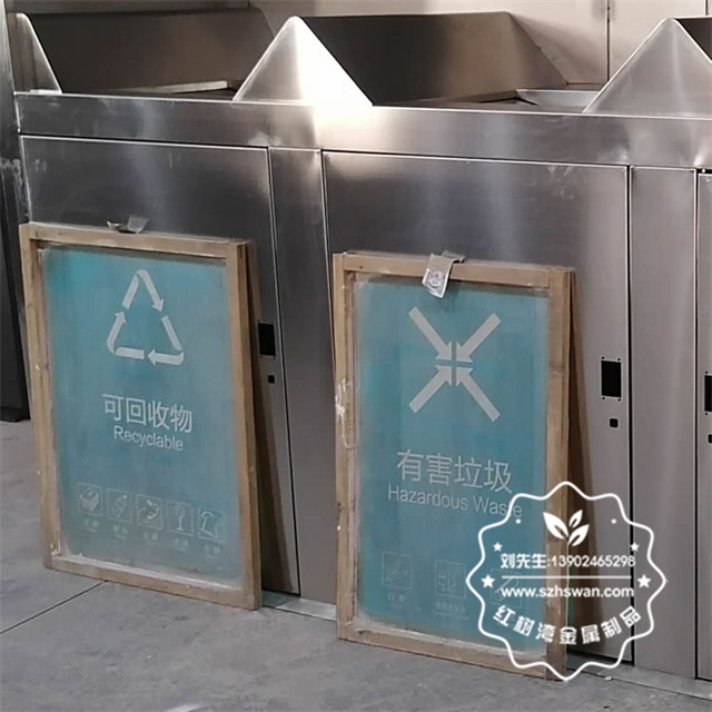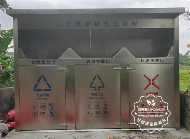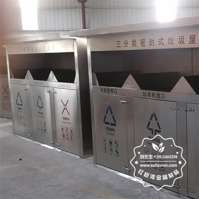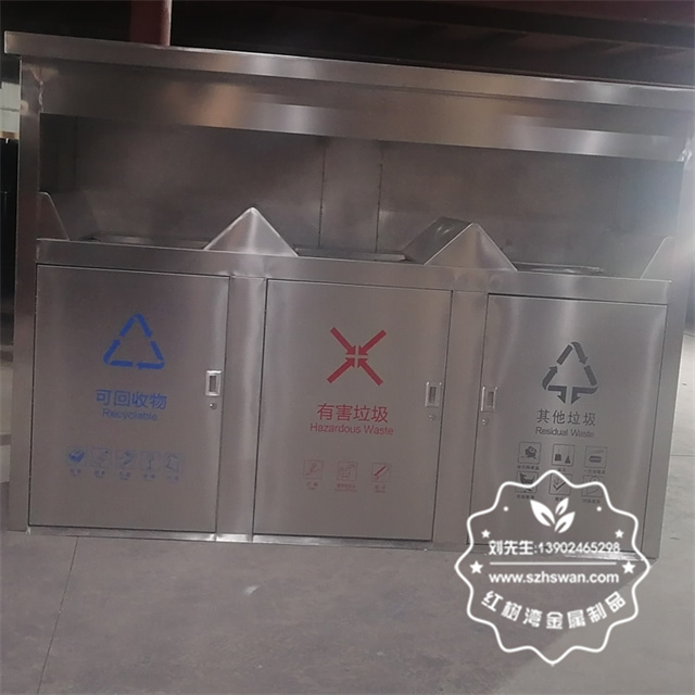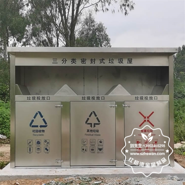 產品材質:戶外密閉式三連體不銹鋼分類垃圾屋采用201#,202#,304#優(yōu)質不銹鋼材料模壓成型,堅固耐用;內外表面光潔,減少垃圾殘留,易于清潔;配置鍍鋅板內桶,便于垃圾清倒;