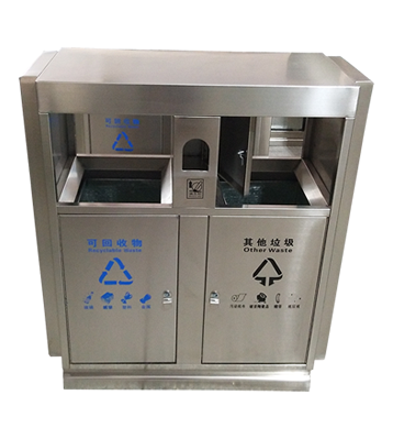產品材質:街道小區學校戶外分類不銹鋼垃圾箱采用201#,202#,304#優質不銹鋼材料模壓成型,堅固耐用;內外表面光潔,減少垃圾殘留,易于清潔;配置鍍鋅板內桶,便于垃圾清倒;