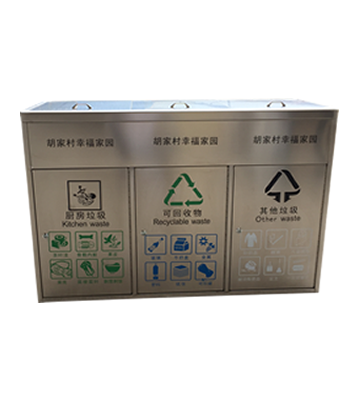 產品材質:社區有蓋三分類戶外分類垃圾桶采用201#,202#,304#優質不銹鋼材料模壓成型,堅固耐用;內外表面光潔,減少垃圾殘留,易于清潔;配置鍍鋅板內桶,便于垃圾清倒;