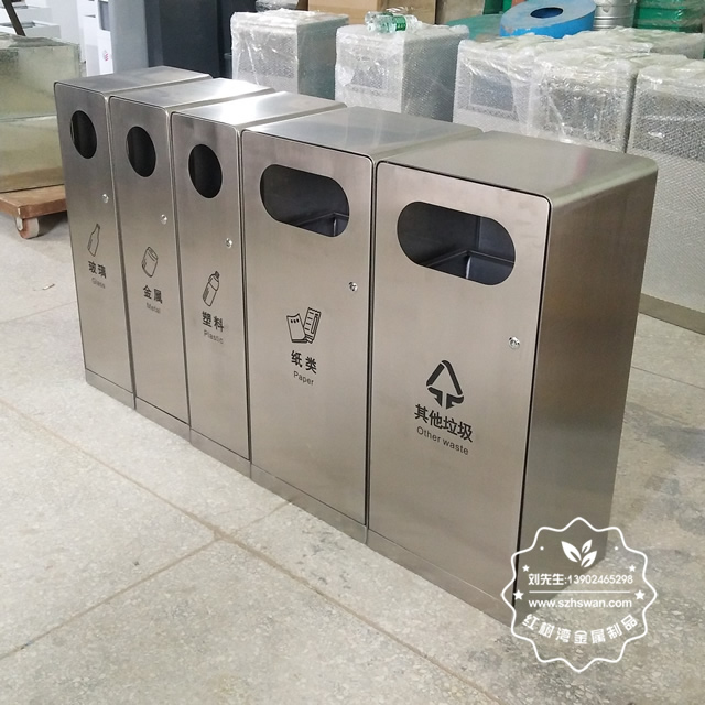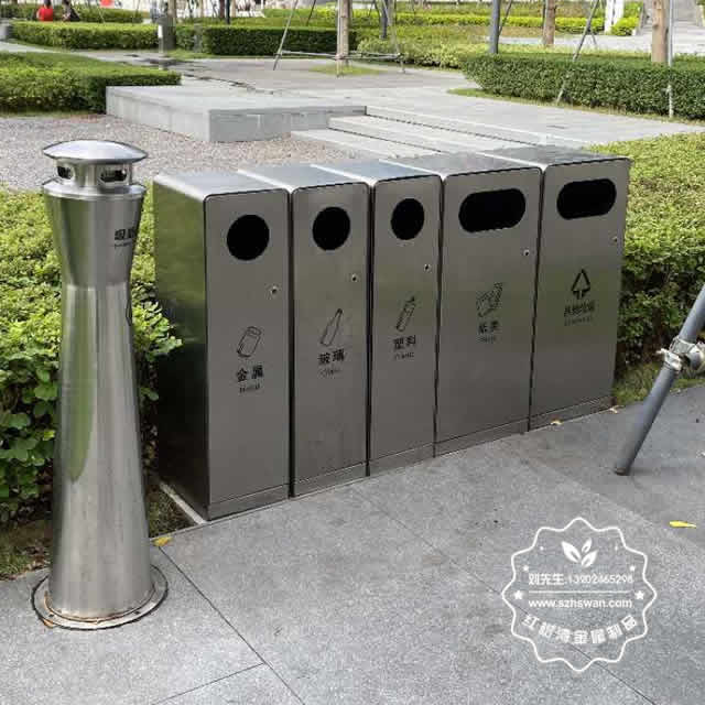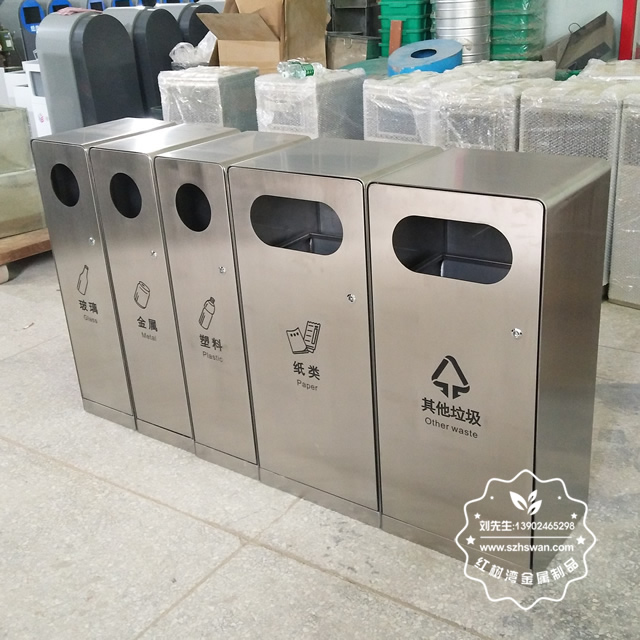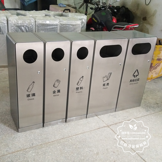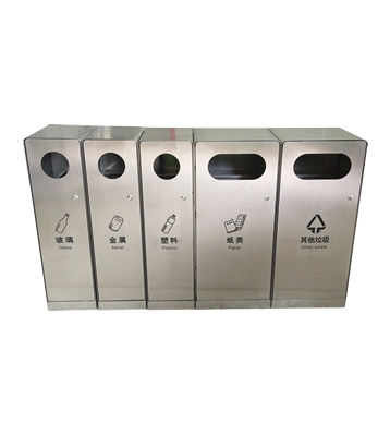 產(chǎn)品材質(zhì):戶外組合式五分類不銹鋼垃圾桶采用201#,202#,304#優(yōu)質(zhì)不銹鋼材料模壓成型,堅(jiān)固耐用;內(nèi)外表面光潔,減少垃圾殘留,易于清潔;配置鍍鋅板內(nèi)桶,便于垃圾清倒;
