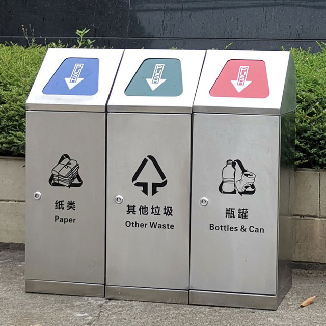 不銹鋼材質賦予了這款垃圾桶卓越的耐用性。它具有出色的抗腐蝕性能,無論是在潮濕的沿海地區,還是在酸堿環境復雜的工業區域,都能長時間保持良好的使用狀態,不易生銹、變形。與傳統的塑料垃圾桶相比,不銹鋼材質更加堅固,能夠承受更大的外力沖擊,即使經過頻繁的使用和搬運,也依然能保持外觀的完整性和功能的穩定性。這不僅減少了垃圾桶的更換頻率,降低了維護成本,還體現了其對環保理念的深度踐行。 清晰分類標識,助力全民分類行動