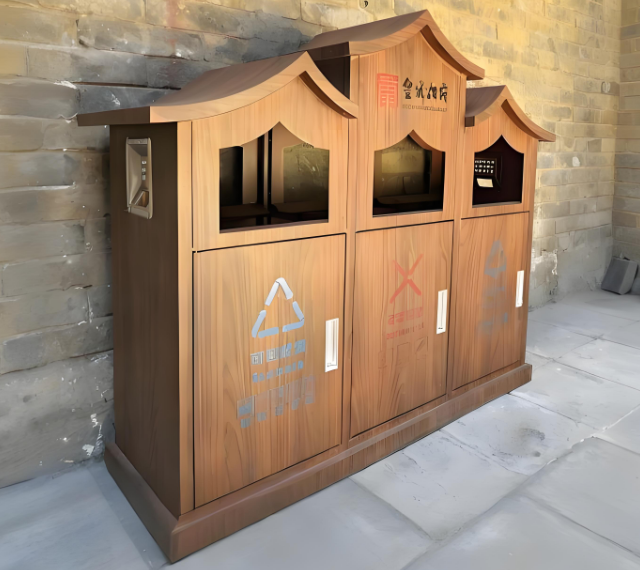 在杭州西溪濕地公園的綠道上,一組造型別致的垃圾桶吸引了游人的目光。這些垃圾桶頂部采用傳統江南民居的坡屋頂造型,表面覆蓋著天然木紋肌理,與周邊竹林景觀完美融合。若不是醒目的垃圾分類標識提示,游客幾乎要將其誤認為園林建筑小品。這些看似藝術裝置的設施,正是當前城市更新浪潮中涌現的戶外轉木紋金屬屋形三分類垃圾桶。它們以獨特的設計語言重構了城市基礎設施的審美范式,將垃圾分類這一環保行為升華為城市空間美學體驗的重要組成。