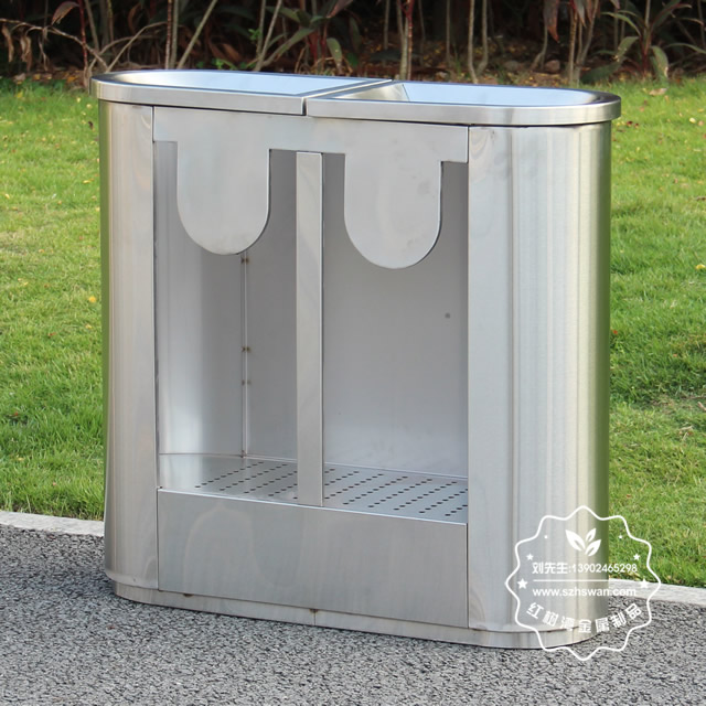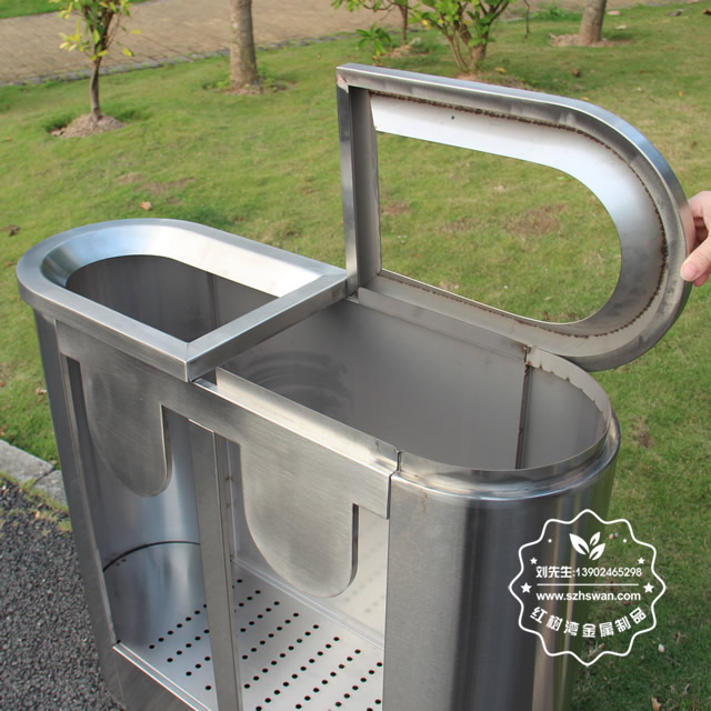 室內雙分類不銹鋼果皮箱采用優質201不銹鋼無縫焊接成型,投口模具沖壓成型,邊角精細打磨拋光圓滑不割手,高檔大氣。