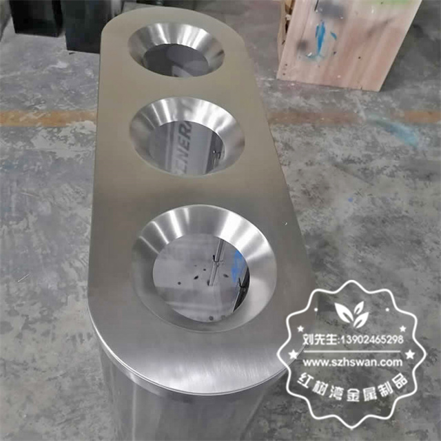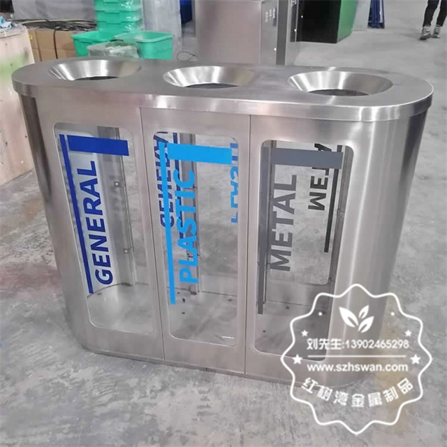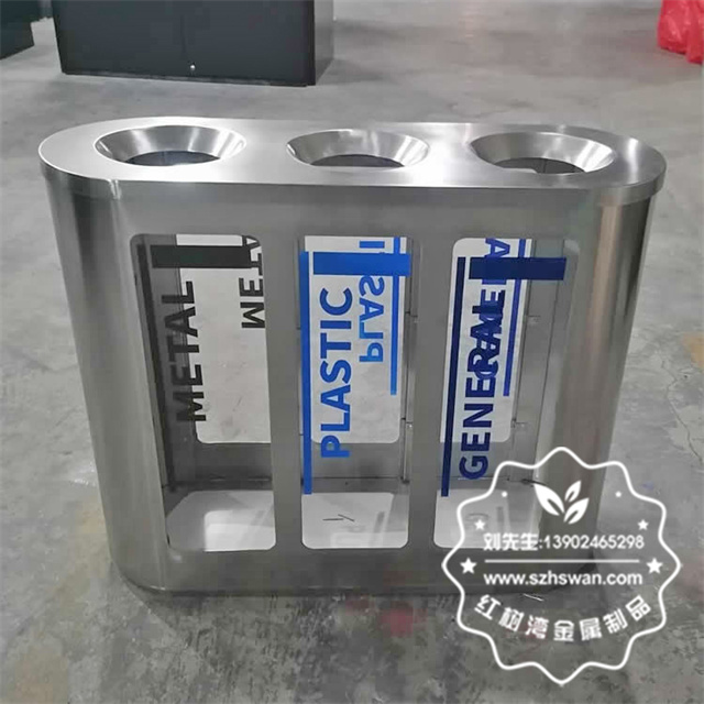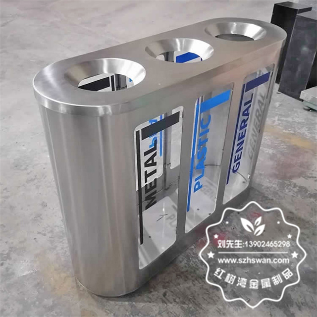 產(chǎn)品材質(zhì):室內(nèi)地鐵站環(huán)保不銹鋼三分類垃圾桶采用201#,202#,304#優(yōu)質(zhì)不銹鋼材料模壓成型,堅(jiān)固耐用;內(nèi)外表面光潔,減少垃圾殘留,易于清潔;配置鍍鋅板內(nèi)桶,便于垃圾清倒;